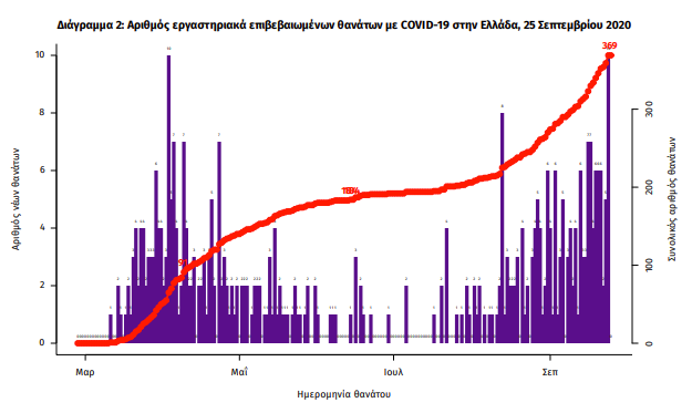 Τέλος, έχουμε 3 ακόμα καταγεγραμμένους θανάτους και 369 θανάτους συνολικά στη χώρα. 138 (37.4%) γυναίκες και οι υπόλοιποι άνδρες. Η διάμεση ηλικία των θανόντων συμπολιτών μας ήταν τα 78 έτη και το 97.0% είχε κάποιο υποκείμενο νόσημα ή/και ηλικία 70 ετών και άνω.