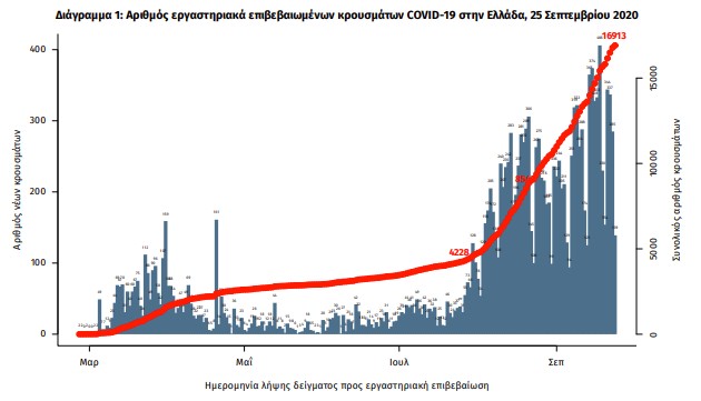 Ο ΕΟΔΥ ανακοίνωσε σήμερα 286 νέα κρούσματα του νέου ιού στη χώρα, εκ των οποίων 31 συνδέονται με γνωστές συρροές και 37 εντοπίστηκαν κατόπιν ελέγχων στις πύλες εισόδου της χώρας. Ο συνολικός αριθμός των κρουσμάτων είναι 16913, εκ των οποίων το 55.7% άνδρες.