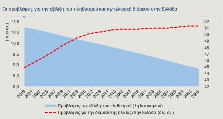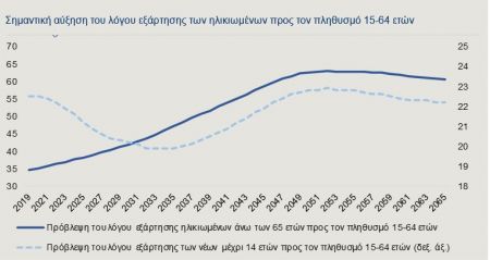 Χαρακτηριστικές ως προς τις δημογραφικές εξελίξεις στην Ελλάδα είναι οι προβλέψεις της Ευρωπαϊκής Στατιστικής Υπηρεσίας (Eurostat) σε χρονικό ορίζοντα περίπου 45 ετών. Σύμφωνα με τις πληθυσμιακές προβολές, η διάμεση ηλικία για τον ελληνικό πληθυσμό θα αυξηθεί κατά 6,4 έτη μέχρι το 2065 σε σχέση με το 2019, φθάνοντας στα 51,3 έτη. Κατ’ αναλογία, όπως φαίνεται και στο Γράφημα 2, ο λόγος εξάρτησης των άνω των 65 ετών προς τους εργαζόμενους ηλικίας 15-64 ετών, προβλέπεται ότι από 34,6 το 2019 θα αυξηθεί σημαντικά το 2065, φτάνοντας στο 60,5, με το ποσοστό των ατόμων άνω των 65 στο σύνολο του πληθυσμού να φτάνει το 33,1%, από 22% το 2019. Οι προβλέψεις στηρίζονται στην υπόθεση ότι το προσδόκιμο ζωής θα αυξηθεί και το ποσοστό γεννητικότητας θα παραμείνει σε χαμηλά επίπεδα, κάνοντας επίσης τη δυσμενή πρόβλεψη για σημαντική μείωση του συνολικού πληθυσμού της χώρας. Από τα δημογραφικά δεδομένα συνεπάγεται ότι αν το σύστημα της χώρας παραμείνει καθαρά διανεμητικό, οι μελλοντικές γενεές θα έρθουν αντιμέτωπες με σημαντικές μειώσεις στις παροχές τους και συνέχιση των ελλειμμάτων στον κρατικό προϋπολογισμό.