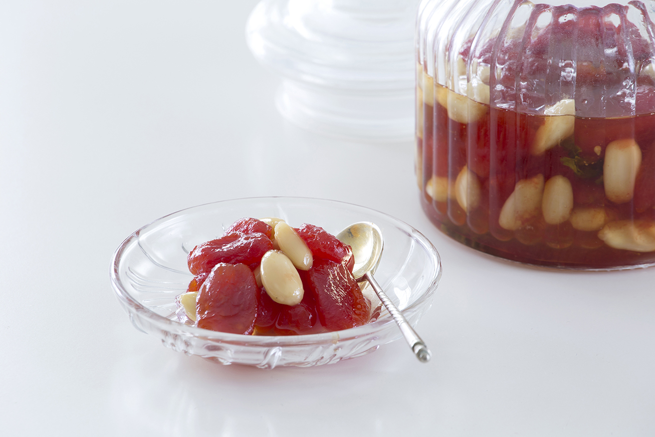 Βράζουμε τη ζάχαρη με το νερό για 10 λεπτά σε μέτρια φωτιά και προσθέτουμε τα ντοματίνια μαζί με τα αμύγδαλα και τα φύλλα αρμπαρόριζας. Χαμηλώνουμε τη φωτιά και συνεχίζουμε το βράσιμο μέχρι να αρχίσει να βγάζει φουσκάλες το μείγμα, δηλαδή 20 – 30 λεπτά. Οταν θέλουμε να ανακατέψουμε, κρατάμε την κατσαρόλα από τις δυο πλευρές της και την κουνάμε δεξιά-αριστερά, δεν χρησιμοποιούμε κουτάλα. Προσθέτουμε τη βανίλια και το λεμόνι και μετά από 5 λεπτά αποσύρουμε από τη φωτιά.