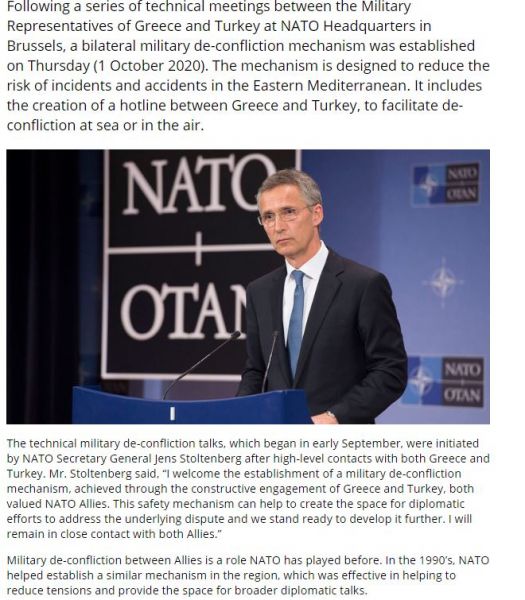 «Μετά από μια σειρά τεχνικών συναντήσεων μεταξύ των Στρατιωτικών Εκπροσώπων της Ελλάδας και της Τουρκίας στα κεντρικά γραφεία του ΝΑΤΟ στις Βρυξέλλες, δημιουργήθηκε διμερής στρατιωτικός μηχανισμός αποφυγής εμπλοκής, την Πέμπτη (1 Οκτωβρίου 2020). Ο μηχανισμός έχει σχεδιαστεί για τη μείωση του κινδύνου συμβάντων και ατυχημάτων στην Ανατολική Μεσόγειο. Περιλαμβάνει τη δημιουργία μιας ανοιχτής γραμμής μεταξύ Ελλάδας και Τουρκίας, για τη διευκόλυνση της αποκλιμάκωσης της έντασης στη θάλασσα ή στον αέρα» αναφέρει η συμφωνία.