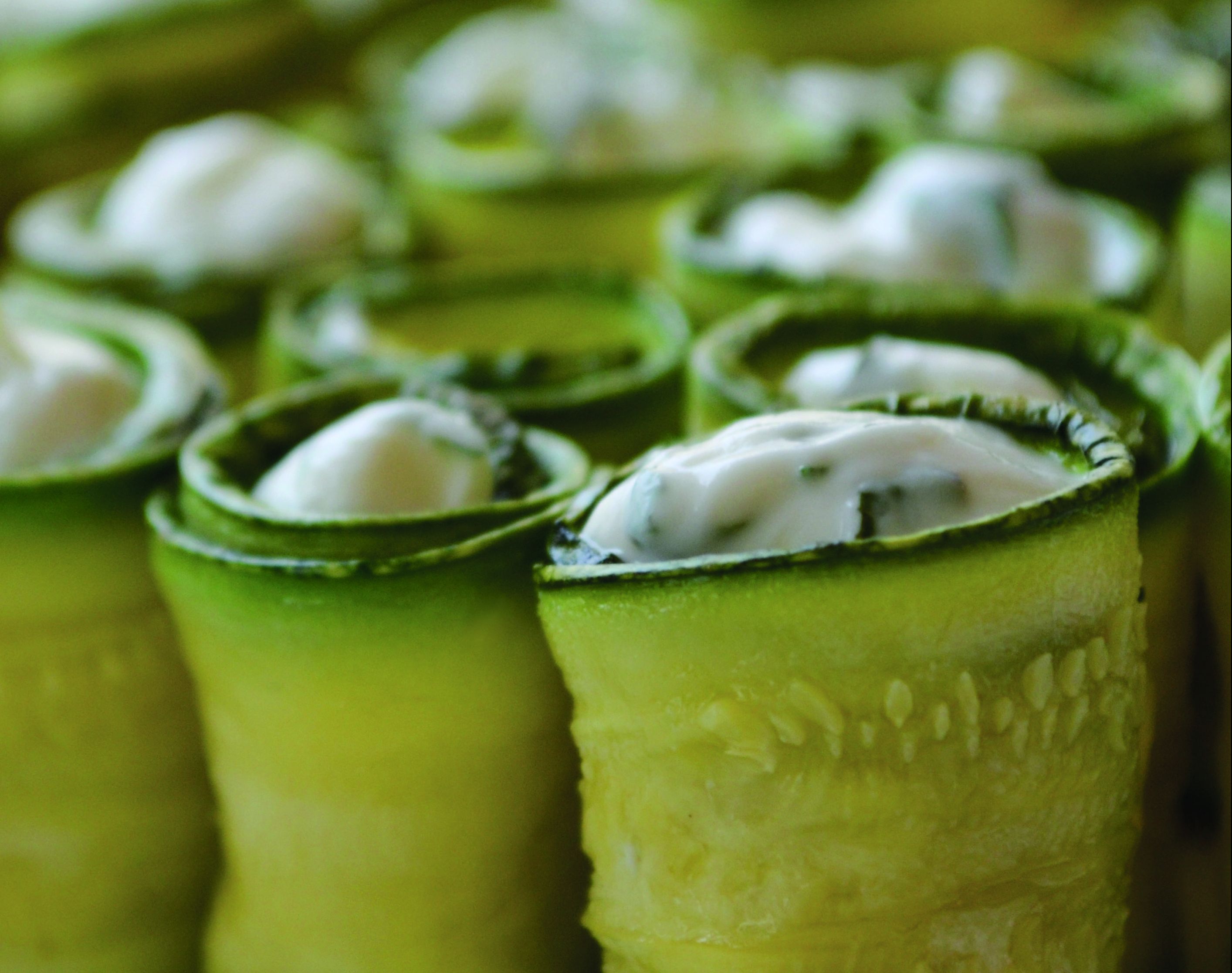 Σε ένα ταψί στρώνουμε αντικολλητικό χαρτί και απλώνουμε τις φέτες κολοκυθιού. Ψήνουμε σε προθερμασμένο φούρνο στους 170°C για 15 λεπτά. Βγάζουμε από τον φούρνο και αφήνουμε για 10 λεπτά να κρυώσουν τα κολοκύθια. Πλένουμε τα φρέσκα μυρωδικά, τα ψιλοκόβουμε, τα ανακατεύουμε με το τυρί κρέμα και αλατοπιπερώνουμε. Βάζουμε μία μικρή κουταλιά από το μείγμα του τυριού με τα μυρωδικά στην άκρη κάθε φέτας κολοκυθιού και τυλίγουμε έτσι ώστε να σχηματιστούν ρολάκια.