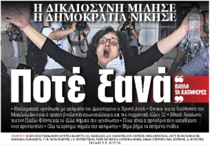 • Εγκληματική οργάνωση με απόφαση του Δικαστηρίου η Χρυσή Αυγή • Ενοχοι για τη διεύθυνσή της Μιχαλολιάκος και 6 πρώην βουλευτές-πρωτοπαλίκαρα και για συμμετοχή άλλοι 12 • Ηθική δικαίωση για τον Παύλο Φύσσα και τα άλλα θύματα της οργάνωσης • Ποια είναι η πρόεδρος που καταδίκασε τους χρυσαυγίτες • Ολα τα κρίσιμα σημεία της απόφασης • Βήμα-βήμα τα επόμενα στάδια