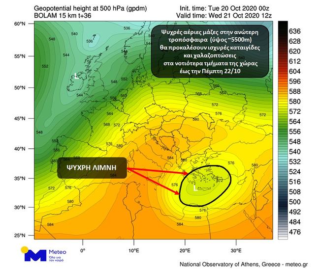 Οι χαμηλές θερμοκρασίες που θα επικρατήσουν από σήμερα έως και την Πέμπτη στα ανώτερα στρώματα της τροπόσφαιρας, οι οποίες στο χάρτη που ακολουθεί έχουν τη μορφή ψυχρής λίμνης, θα ευνοήσουν την εκδήλωση ισχυρών βροχοπτώσεων και καταιγίδων που κατά τόπους θα συνοδεύονται από χαλαζοπτώσεις, στα ανατολικά και κυρίως στα νότια ηπειρωτικά και θαλάσσια τμήματα της χώρας, αναφέρει η υπηρεσία meteo.gr του Εθνικού Αστεροσκοπείου.