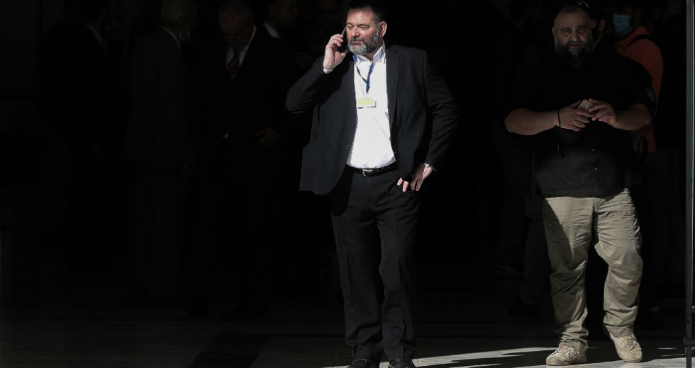 Με το που ανέβηκε το προεδρείο, ο Ηλίας Κασιδιάρης μπήκε στη δικαστική αίθουσα και κάθισε αρκετά πιο πίσω από τους άλλους συγκατηγoρούμενούς του που είναι παρόντες.
