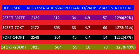 Κάτι που αποτυπώνει αριθμητικά και στατιστικά τις χθεσινές δηλώσεις του Υφυπουργού Πολιτικής Προστασίας Νίκου Χαρδαλιά αλλά και των επιδημιολόγων για τον αυξημένο αριθμό νέων φορέων ηλικίας μέχρι 40 ετών που δεν λαμβάνουν προληπτικά μέτρα. Στη συνέχεια της απροσεξίας και πάλι των ατόμων νεαρής ηλικίας στα τουριστικά θέρετρα που προκαλέσαν «φθινοπωρινή επιμόλυνση» ατόμων μεγαλύτερης ηλικίας και τη ραγδαία αύξηση των θανάτων.