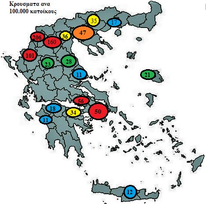 Ωστόσο λιγότερα, αναλογικά με τον πληθυσμό τους, είναι τα κρούσματα σε Αχαΐα, Ηλεία, Μαγνησία, Καβάλα κι Ηράκλειο.