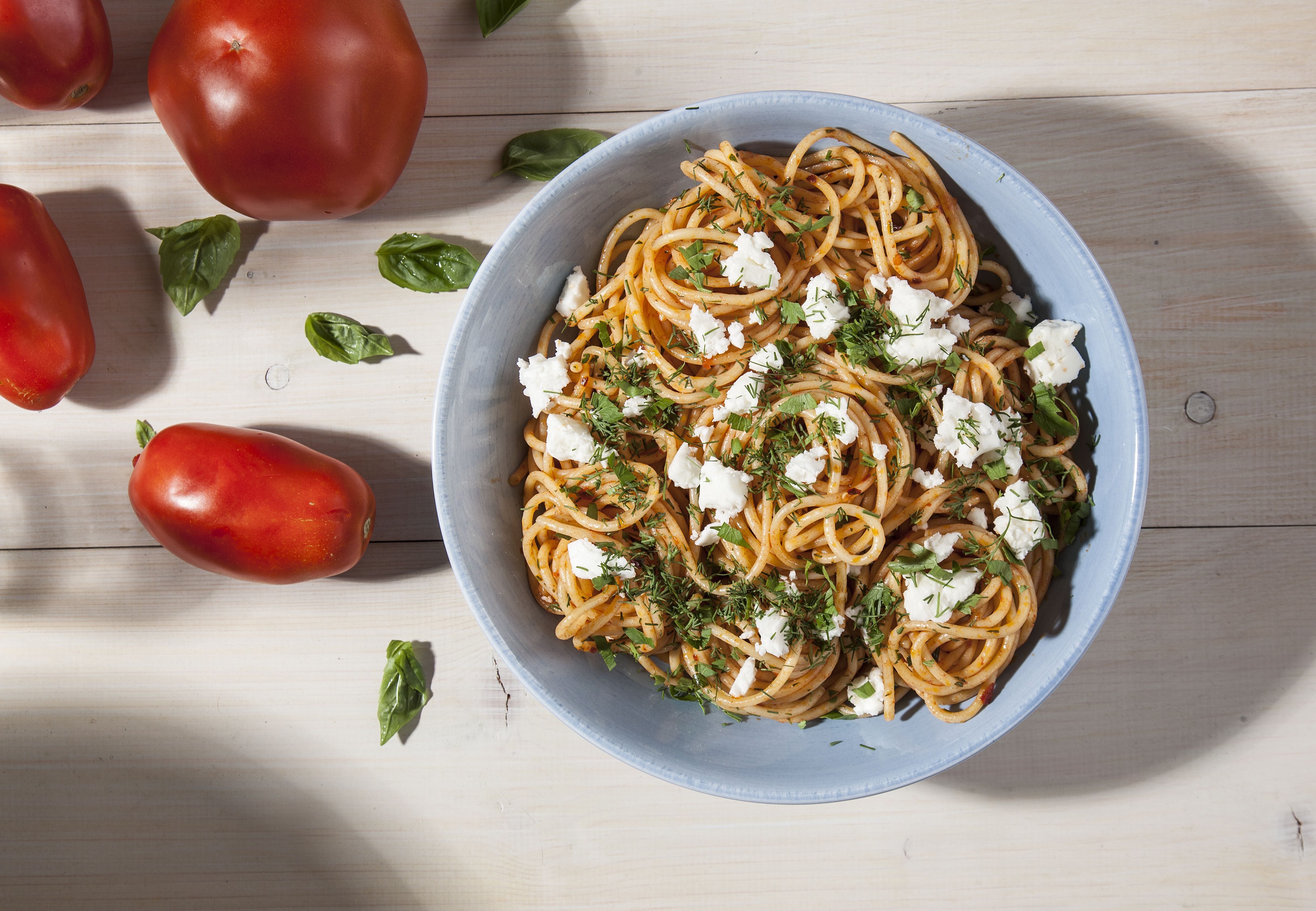 Σε ένα άλλο φαρδύ σκεύος βάζουμε λίγο ελαιόλαδο σε χαμηλή φωτιά, μπούκοβο (σε ποσότητα ανάλογη με τις προτιμήσεις μας) και δύο σκελίδες σκόρδο χωρίς τη φύτρα για περίπου πέντε λεπτά μέχρι να ροδίσουν ελαφρά και να αρωματίσουν το λάδι. Ρίχνουμε μία κουτάλα «μαγικό ζωμό» ντομάτας ανά μερίδα και τα σπαγγέτι ανακατεύοντας συνεχώς όπως στο ριζότο, για να απορροφήσει το ζυμαρικό το νερό ντομάτας ολοκληρώνοντας τον βρασμό του. Το λάδι με τον ζωμό και το άμυλο θα δημιουργήσουν ένα «γαλάκτωμα» γεμάτο γεύση. Σερβίρουμε αμέσως σε βαθύ πιάτο με λίγο ακόμα ελαιόλαδο, τριμμένη φέτα και μυρωδικά.