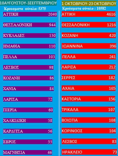 Ακόμη «Το Βήμα» παρουσιάζει συγκριτικό πίνακα – κατάταξη με τα κρούσματα ανά περιοχή το διάστημα από την 1η Οκτωβρίου έως χθες 23 Οκτωβρίου (23 ημέρες) σε σχέση με την περίοδο 10 Αυγούστου έως 3 Σεπτεμβρίου(24 ημέρες) που αφορά κυρίως τις καλοκαιρινές διακοπές.