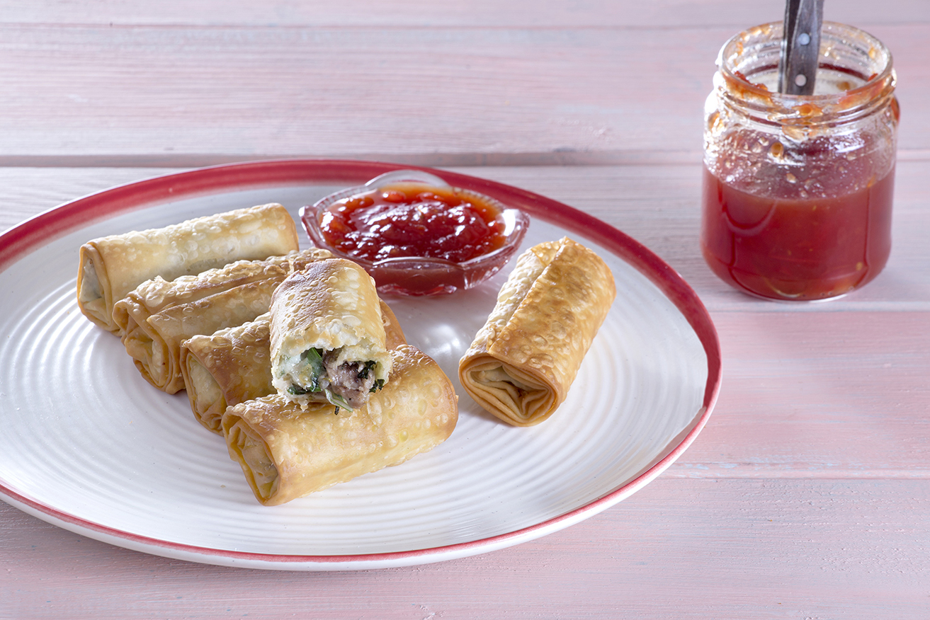Συναρμολόγηση: Κόβουμε το κάθε φύλλο στα 4 και το λαδώνουμε περιμετρικά. Απλώνουμε κατά μήκος της μίας πλευράς λίγη από τη γέμιση και τυλίγουμε σαν φλογέρα. Επαναλαμβάνουμε μέχρι να μας τελειώσουν τα φύλλα. Βάζουμε μπόλικο σπορέλαιο σε ένα τηγάνι και τηγανίζουμε τις φλογέρες ώστε να ροδίσουν από όλες τις πλευρές. Σερβίρουμε με μαρμελάδα ντομάτας.