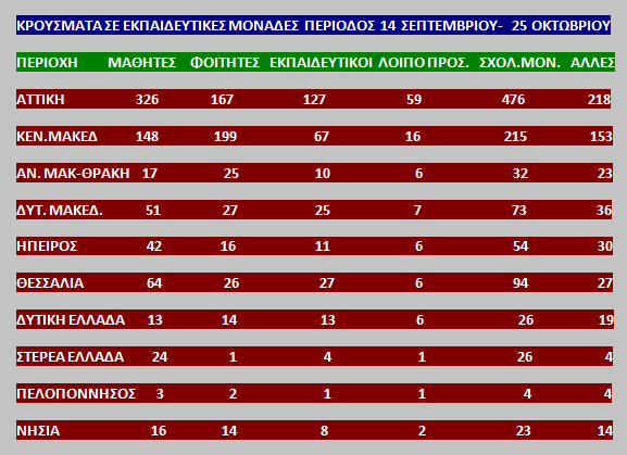 Ακόμη διαπιστώνεται ότι συνολικά κρούσματα κορωνοϊού έχουν παρουσιασθεί σε 1.023 σχολικές μονάδες (εκ των οποίων 47% στην Αττική) και σε 528 διάφορες άλλες εκπαιδευτικές μονάδες,