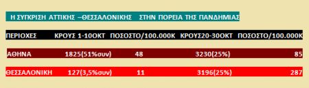 Είναι ενδεικτικό ότι στην Αττική το τελευταίο δεκαήμερο διαγνώσθηκαν με Covid-19 συνολικά 3.230 άτομα, όσα δηλαδή περίπου και στη Θεσσαλονίκη όμως λόγω του ότι έχει πληθυσμό σχεδόν τετραπλάσιο (3.742.000 σε σχέση με τα 1.110.000 του νομού Θεσσαλονίκης) αυτό αντιστοιχεί σε 85 κρούσματα ανά 100.000 κατοίκους. Δηλαδή πιο απλά ο νομός Θεσσαλονίκης έχει τετραπλάσιο πρόβλημα από τον επιδημιολογικό φόρτο από την Αττική. Σημειώνεται ότι στο λεκανοπέδιο το πρώτο δεκαήμερο του Οκτωβρίου είχαν σημειωθεί 1.825 κρούσματα που εκείνη την περίοδο ήταν το 51% των συνολικών κρουσμάτων όλης της χώρας (3603).