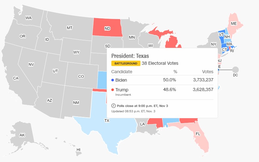 Από την πλευρά του, ο Τζο Μπάιντεν φέρεται πως ηγείται στην πολιτεία του Τέξας, μια σημαντική πολιτεία για την κατάληξη των εκλογικών αποτελεσμάτων καθώς διαθέτει 38 εκλέκτορες.