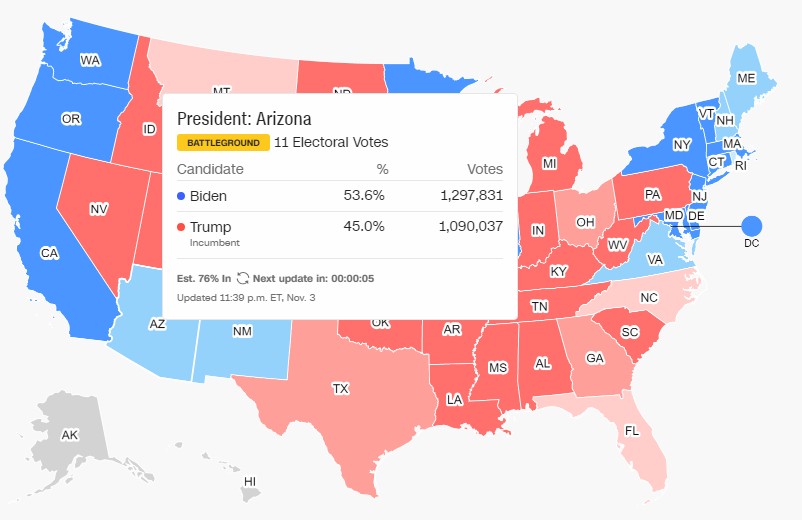 Σημειώνεται πως αν ο Μπάιντεν κερδίσει την Αριζόνα, του δίνονται πολλά περιθώρια για νίκη ακόμη κι αν χάσει την Πενσυλβάνια -όπως συμβαίνει τώρα- αρκεί να επικρατήσει στο Μίσιγκαν και το Ουϊσκόνσιν.
