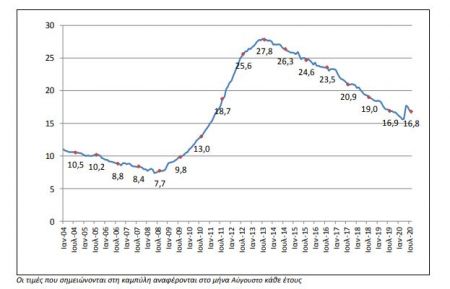 Σύμφωνα με τα στοιχεία της Στατιστικής Υπηρεσίας, το ποσοστό ανεργίας τον Αύγουστο του 2020 ανήλθε σε 16,8% έναντι 16,9% τον Αύγουστο του 2019 και 17% τον Ιούλιο του 2020.