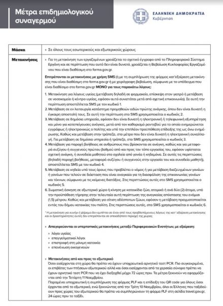 Η μετακίνηση των εργαζομένων χρειάζεται το σχετικό έγγραφο από το Πληροφοριακό Σύστημα Εργάνη. Αν για οποιονδήποτε λόγο είτε επειδή υπάρχουν προβλήματα στο σύστημα ή για οποιονδήποτε άλλο λόγο δεν μπορεί να εξασφαλιστεί τότε μπορεί να ισχύσει και η βεβαίωση κυκλοφορίας εργαζομένου που είναι διαθέσιμη στο forma.gov.gr.
