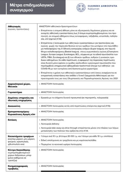 Ανοιχτά μένουν τα σχολεία πρωτοβάθμιας εκπαίδευσης και τα σχολεία ειδικής αγωγής, τα ξενοδοχεία, στα οποία δίνεται δυνατότητα αναστολής, ο πρωτογενής και ο δευτερογενής τομέας και από τον τριτογενή συγκεκριμένες δραστηριότητες.