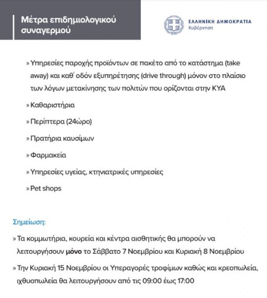 - Οι υπηρεσίες παροχής προϊόντων σε πακέτο από το κατάστημα (take away) και καθ΄ οδόν εξυπηρέτησης (drive through) επιτρέπονται μόνον στο πλαίσιο των λόγων μετακίνησης των πολιτών που ορίζονται στην ΚΥΑ. Δεν αποτελούν, δηλαδή, ξεχωριστό λόγο μετακίνησης.