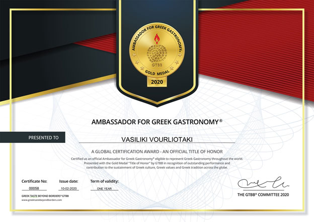 Η γνωστή ως “Βασιλική” δεν είναι μια κοινή executive chef… Είναι μια πρέσβειρα για την ελληνική γαστρονομία! Ο οργανισμός Greek Taste Beyond Borders® GTBB γνωστός για τη διάδοση της ελληνικής γαστρονομίας στον κόσμο και την δημιουργία του πληρέστερου business network στον χώρο της ελληνικής γεύσης με συνεχή παγκόσμια συνέδρια υπό την αιγίδα του κράτους, πιστοποίησε-βράβευσε την Βασιλική Βουρλιωτάκη με τον επίσημο τίτλο “Πρεσβευτής της Ελληνικής Γαστρονομίας 2020 – Gold Medal”. Πρόκειται για έναν τίτλο ανώτατου κύρους που απονέμεται μόνο σε επαγγελματίες chef που πληρούν αυστηρά κριτήρια, ανάμεσα σε αυτά και η άρτια εκπροσώπηση της ελληνικής κουζίνας στο εξωτερικό σε ένα ευρύτερο πλαίσιο πολιτισμού και κουλτούρας, που προάγει εν τέλει τον ελληνικό τρόπο ζωής. Η Βασιλική κατάφερε να κατακτήσει τη Νέα Υόρκη αρκετά νέα και συγκαταλέγεται ήδη ανάμεσα στις κορυφαίες Ελληνίδες chef στον κόσμο, ύστερα από μια πορεία που διαδεχόταν τη μια επιτυχία μετά την άλλη!