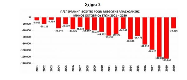 Τo ισοζύγιο ροών μισθωτής απασχόλησης του Π/Σ «ΕΡΓΑΝΗ», για τον μήνα Οκτώβριο 2020, κατέγραψε τις μικρότερες απώλειες −33.356 θέσεων εργασίας σε βάθος 12ετιας.