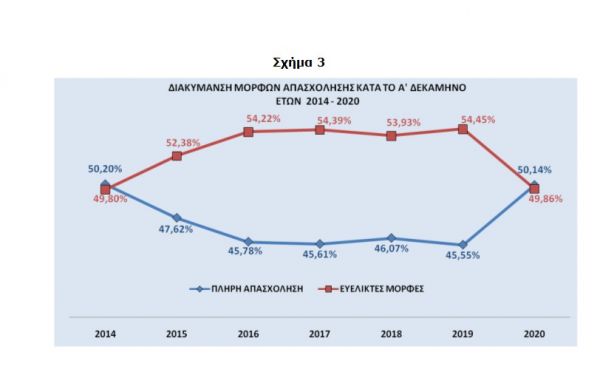 Η πλήρη απασχόληση κατέγραψε αύξηση στο 50,14% (Σχ.3) την περίοδο Ιανουαρίου-Οκτωβρίου 2020 για τις νέες θέσεις εργασίας.