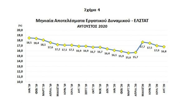 Επιπλέον, σύμφωνα με τα πρόσφατα αποτελέσματα της ΕΛΣΤΑΤ, για τον μήνα Αύγουστο 2020, το γενικό ποσοστό ανεργίας ανήλθε στο 16,8% παρουσιάζοντας οριακή μείωση −0,1% συγκριτικά με τον Αύγουστο του 2019 και −0,2% σε σχέση με τον Ιούλιο του 2020.