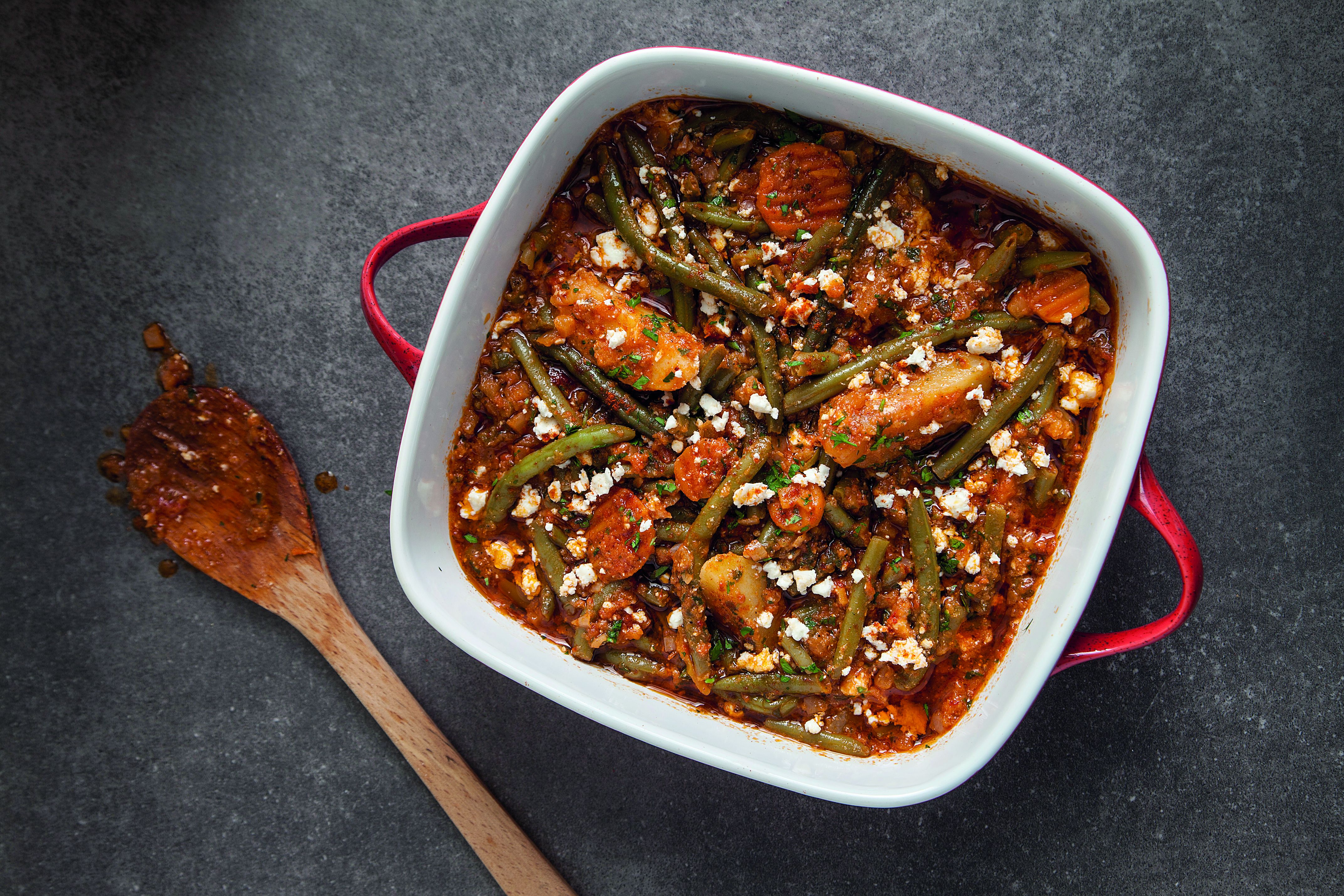 Ακολουθούμε τις οδηγίες του πακέτου, με μια διαφορά: αντικαθιστούμε τη συσκευασία ντομάτας στον τρίφτη που προτείνεται με φρέσκια ντομάτα που θα τρίψουμε εμείς. Προσθέτουμε την καπνιστή πάπρικα και μαγειρεύουμε σε χαμηλή φωτιά. Πέντε λεπτά πριν ετοιμαστεί το φαγητό μας, βάζουμε τη φέτα και τον μαϊντανό (ή τον βασιλικό) και ανακατεύουμε. Αν χρειαστεί προσθέτουμε μισό ποτήρι νερό στη διάρκεια του μαγειρέματος. Αν στο τέλος του μαγειρέματος η σάλτσα είναι αραιή και υδαρής, βγάζουμε τα φασολάκια και τη βράζουμε σε δυνατή φωτιά μέχρι να δέσει. Γαρνίρουμε με λίγο επιπλέον ψιλοκομμένο μαϊντανό και καπνιστή πάπρικα.