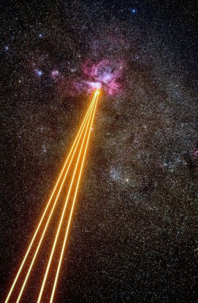 Σε αυτή τη θεαματική εικόνα που συνέλαβε το τηλεσκόπιο VLT στη Χιλή, το Νεφέλωμα της Τρόπιδας μοιάζει να επιτίθεται στη Γη με όπλα λέιζερ.