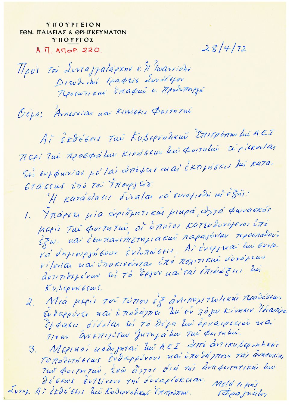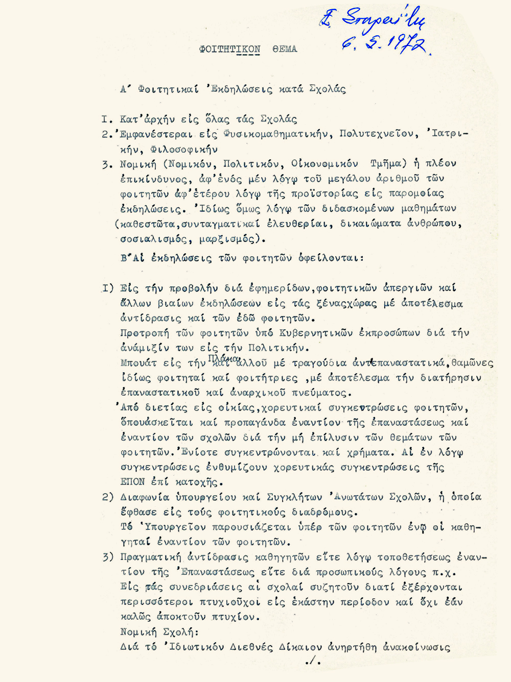 «Εις τούτο συμβάλλουν ενεργώς και κατά τρόπον μεθοδικόν αι διάφοροι κομμουνιστικαί και ανατρεπτικαί οργανώσεις Εσωτερικού και Εξωτερικού, ως και το επικρατούν διεθνώς σπουδαστικόν κλίμα αναταραχής, συνεπεία του οποίου έχει δημιουργηθή μια μάζα, μικρά εις αριθμόν, αποτελούμενη εξ αργόσχολων και “μοντερνιζόντων” φοιτητών, ήτις στερουμένη ηθικών και εθνικών ερεισμάτων και ενδιαφέροντος διά την Παιδείαν, προσπαθεί να παρασύρη το σύνολον των σπουδαστών εις ανατρεπτικάς ενεργείας» υπογράμμιζε σε έκθεσή του προς τον Παπαδόπουλο ο διευθυντής της ΚΥΠ.