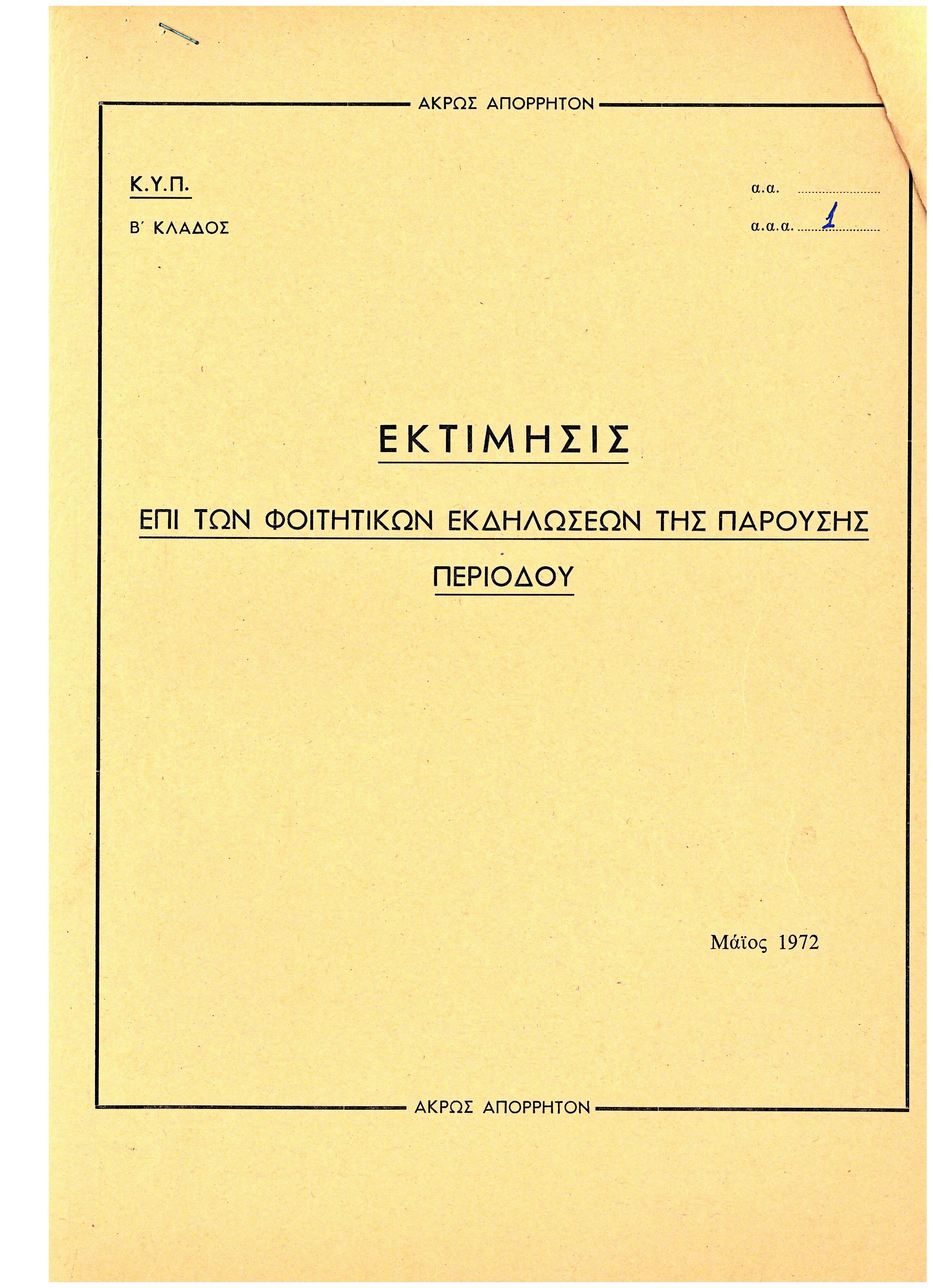 Ηταν 4 Μαΐου 1972 και η χουντική ΚΥΠ (Κρατική Υπηρεσία Πληροφοριών) ενημέρωνε με πολυσέλιδη έκθεσή της «επί των Φοιτητικών εκδηλώσεων της παρούσης περιόδου» τον αρχιπραξικοπηματία Γεώργιο Παπαδόπουλο. Ο περιβόητος διευθυντής της ΚΥΠ Αλέξανδρος Χατζηπέτρος με επείγον απόρρητο-προσωπικό αναλυτικό έγγραφό του εξέθετε όλα τα δεδομένα της φάσης εκείνης κατά την οποία οι κινητοποιήσεις και αντιδράσεις από τον φοιτητικό χώρο κλιμακώνονταν, για να πάρουν έναν χρόνο μετά την ορμή που οδήγησε στην κατάληψη της Νομικής (Φεβρουάριος 1973) και στην εξέγερση του Πολυτεχνείου (Νοέμβριος 1973), 47 χρόνια πριν.