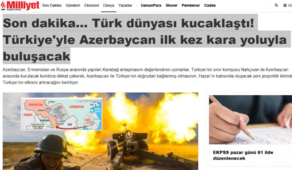 Οι ίδιοι εξηγούν ότι η πρόβλεψη, από τη συμφωνία κατάπαυσης του πυρός, διάνοιξης διαδρόμου, ο οποίος θα συνδέει το Ναχιτσεβάν οδικώς με το Αζερμπαϊτζάν, αλλάζει τα γεωπολιτικά δεδομένα της περιοχής υπέρ της Τουρκίας, σημειώνει η τουρκική εφημερίδα Μιλιέτ.