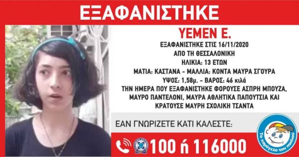 Συναγερμός έχει σημάνει στη Θεσσαλονίκη για την εξαφάνιση της 13χρονης Υεμέν.