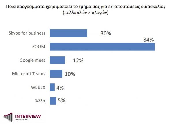 Το 84% των φοιτητών επέλεξαν την πλατφόρμα Zoom για να παρακολουθήσει online μαθήματα εν μέσω της καραντίνας, ενώ σημαντικότερο πρόβλημα που αντιμετώπισαν οι φοιτητές κατά τη διάρκεια της τηλεκπαίδευσης ήταν η κακή σύνδεση στο διαδίκτυο.