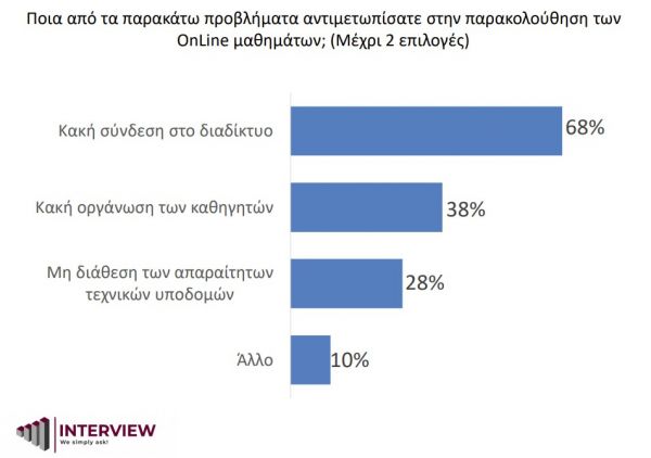 Το σημαντικότερο πρόβλημα που αντιμετώπισαν οι φοιτητές κατά τη διάρκεια της τηλεκπαίδευσης ήταν η κακή σύνδεση στο διαδίκτυο με ποσοστό 68% και έπεται με 38% η κακή οργάνωση των καθηγητών, με 28% η μη διάθεση των απαραίτητων τεχνικών υποδομών και κάτι άλλο με 10%.