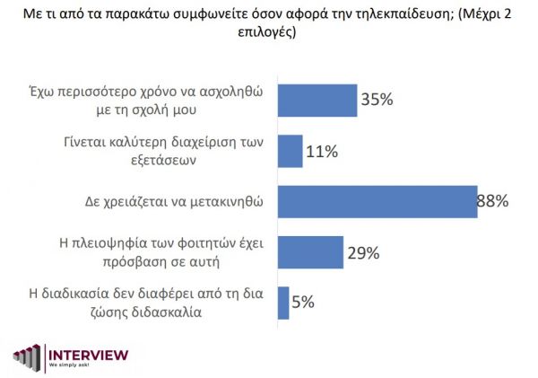 Η τηλεκπαίδευση συμβάλλει στο να μην χρειάζονται μετακινήσεις αναφέρει το 88%, ενώ το 35% σημειώνει πως με την εξ αποστάσεως διδασκαλία έχει περισσότερο χρόνο να ασχοληθεί με την Σχολή του και το 29% ότι με την τηλεκπαίδευση η πλειοψηφία των φοιτητών έχει πρόσβαση σε αυτή.