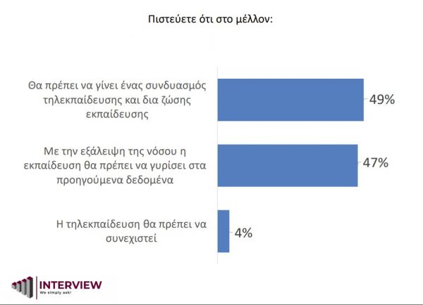 Όσον αφορά στο μέλλον σχεδόν οι μισοί από τους φοιτητές (49%) δηλώνουν ότι χρειάζεται ένας συνδυασμός τηλεκπαίδευσης και δια ζώσης εκπαίδευσης, αλλά την ίδια στιγμή το 47% εκτιμά ότι με την εξάλειψη της νόσου η εκπαίδευση θα πρέπει να επιστρέψει στα προηγούμενα δεδομένα.