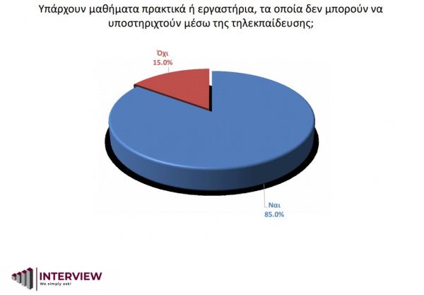 Πάντως, η τηλεκπαίδευση έχει και τα αρνητικά της στοιχεία: το 85% υποστηρίζει ότι υπάρχουν πρακτικά μαθήματα ή εργαστήρια, τα οποία δεν μπορούν να υποστηριχθούν εξ αποστάσεως.