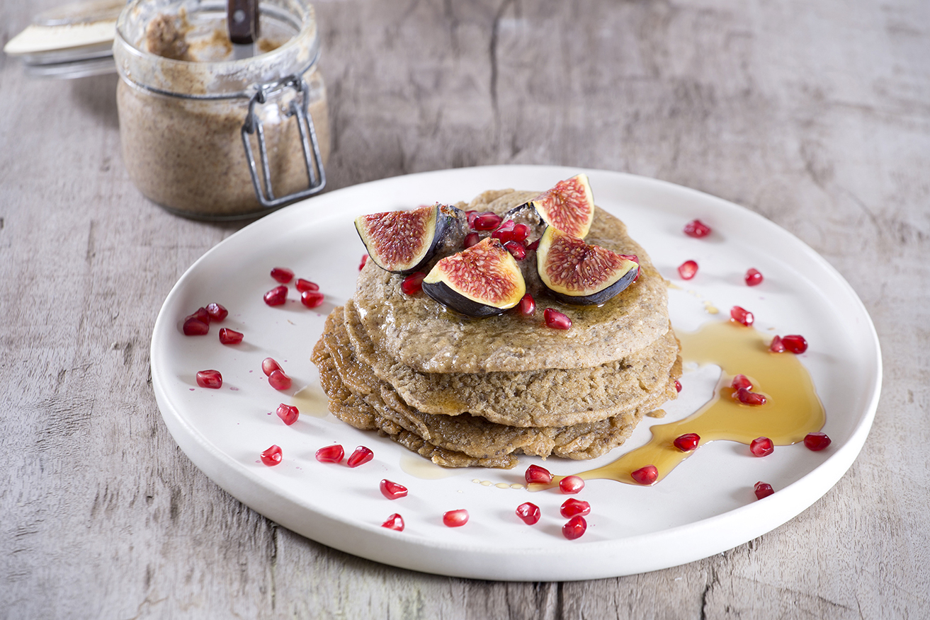 Σερβίρουμε με αμυγδαλοβούτυρο (ή άλλο βούτυρο από ξηρούς καρπούς ή ταχίνι), φρεσκοκομμένα σύκα, ρόδι και σιρόπι σφενδάμου.