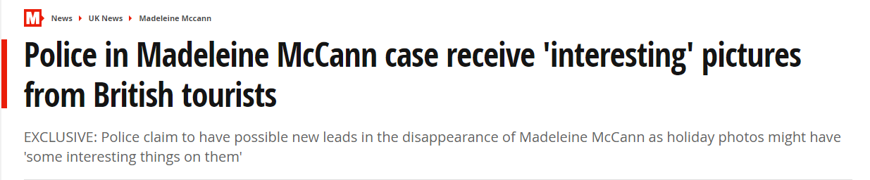 Σύμφωνα με τον Γερμανό εισαγγελέα Χανς Κρίστιαν Βόλτερς, πρόσφατα ήρθαν στην επιφάνεια νέα στοιχεία από την Αγγλία, και συγκεκριμένα φωτογραφίες τουριστών που παραθέριζαν τότε επίσης στο ίδιο μέρος, στις οποίες απεικονίζονται ορισμένα «ενδιαφέροντα πράγματα».