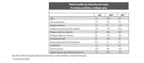 Στη βάση των ανωτέρω, και συμπεριλαμβανομένης της αναθεωρημένης επί τα χείρω εκτίμησης για το βάθος της πανδημίας (σε συμβατότητα με την αναφορά στους καθοδικούς κίνδυνους των οικονομικών προοπτικών που είχε γίνει στο Κεφάλαιο 1 του Προσχεδίου του Κρατικού Προϋπολογισμού 2021), το πραγματικό ΑΕΠ αναμένεται να παρουσιάσει ετήσιο ρυθμό αύξησης σε σχέση με το 2020, 4,8%.