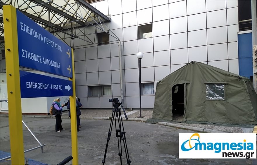 Στρατιωτικές σκηνές έστησε στον προαύλιο χώρο του νοσοκομείου Βόλου το πρωί της Δευτέρας, για ασθενείς με κορωνοϊό, κλιμάκιο του στρατού και της Ταξιαρχίας Πεζοναυτών.