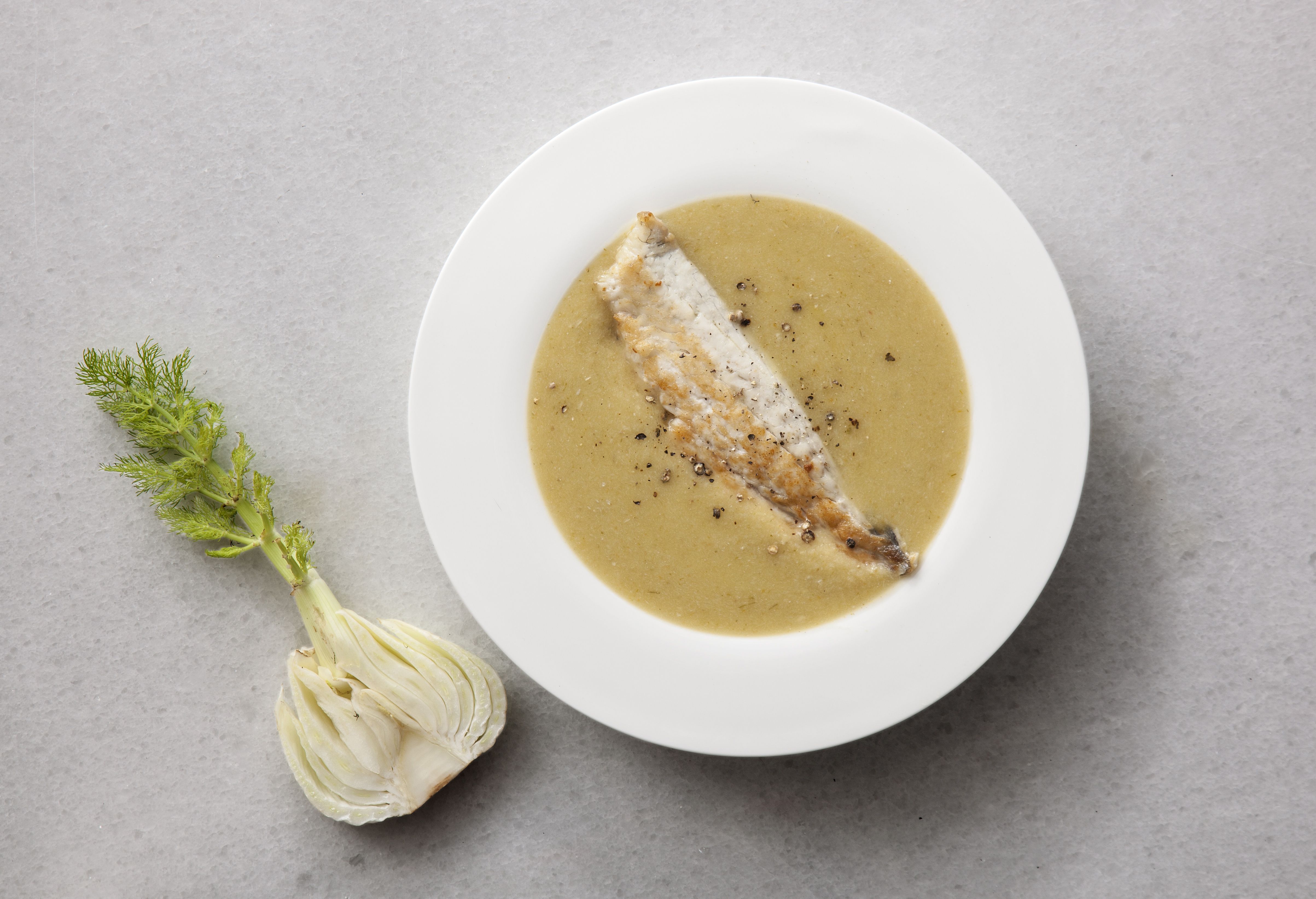 Σοτάρουμε σε ένα τηγάνι με 2-3 κ.σ. ελαιόλαδο τα φιλέτα του ψαριού για 3 λεπτά από κάθε πλευρά. Μοιράζουμε τη βελουτέ σε 4 βαθιά πιάτα και πάνω σε καθεμιά βάζουμε από ένα φιλέτο ψαριού.