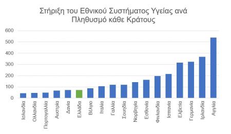 Γράφημα 3: Στήριξη του Εθνικού Συστήματος Υγείας ανά πληθυσμό – Εκατομμύρια ευρώ ως προς τα εκατομμύρια πληθυσμού του κάθε κράτους για επιλεγμένες χώρες [2020], Πηγή: Οργανισμός Οικονομικής Συνεργασίας και Ανάπτυξης (ΟΟΣΑ). Health at a Glance: Europe 2020[5]