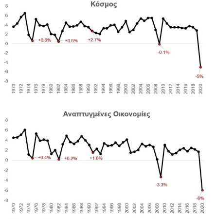 Η παραπάνω εικασία, όμως, μας οδηγεί στη δεύτερη δυσοίωνη παρατήρηση. Η παγκόσμια οικονομία δεν έχει αντιμετωπίσει ποτέ ξανά στη μεταπολεμική της ιστορία αντίστοιχου βεληνεκούς ύφεση. Επιγραμματικά αναφέρουμε πως σύμφωνα με την Παγκόσμια Τράπεζα[2], τα τελευταία εβδομήντα χρόνια από το 1950 και μετέπειτα, η παγκόσμια οικονομία γνώρισε τέσσερις μεγάλες υφέσεις: το 1975, το 1982, το 1991 και το 2009. Και στις τέσσερεις περιπτώσεις παρατηρήθηκε συρρίκνωση στο ετήσιο πραγματικό κατά κεφαλήν παγκόσμιο ΑΕΠ και πτώση των σημαντικότερων δεικτών της παγκόσμιας οικονομικής δραστηριότητας. Εν συγκρίσει, η παγκόσμια ύφεση του 2009 ήταν μακράν αυτή με τη μεγαλύτερη αρνητική επίδραση μεταξύ των τεσσάρων.
