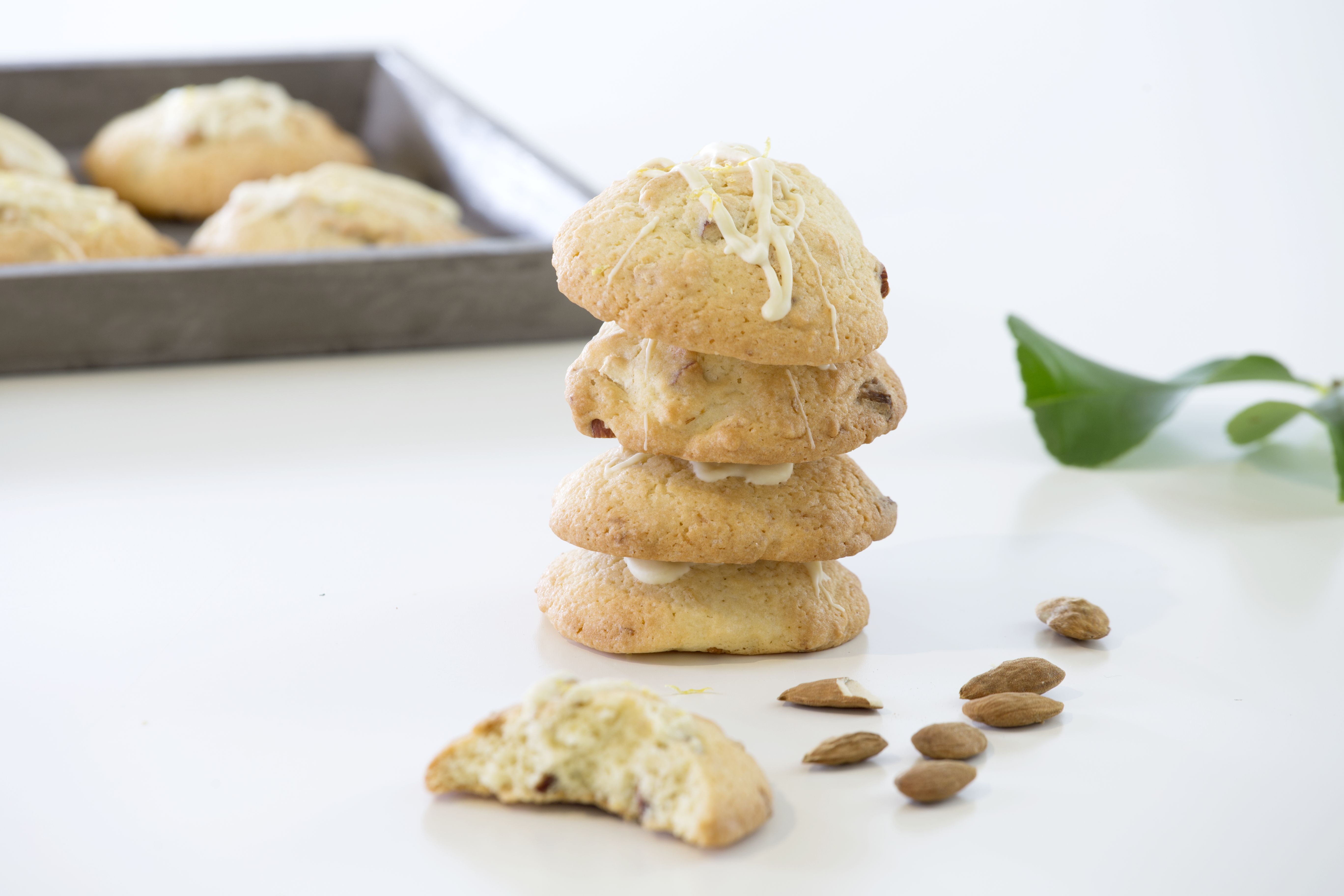 Προθερμαίνουμε τον φούρνο στους 170°C. Κοσκινίζουμε σε ένα μπολ το αλεύρι με το μπέικιν πάουντερ. Χτυπάμε καλά στο μίξερ το βούτυρο με τη ζάχαρη, για 6′ – 8′, να ασπρίσει το μείγμα. Προσθέτουμε ένα-ένα τα αβγά και κατόπιν το ξύσμα. Σταματάμε το μίξερ και ρίχνουμε το μείγμα το κοσκινισμένου αλευριού. Ανακατεύουμε με μια σπάτουλα. Τέλος ενσωματώνουμε τα αμύγδαλα και τα 85 γρ. από τη λευκή κουβερτούρα. Παίρνουμε, με ένα κουτάλι, λίγη από τη ζύμη και τη βάζουμε στη λαμαρίνα του φούρνου που έχουμε ντύσει με λαδόκολλα. Συνεχίζουμε με την υπόλοιπη ζύμη, αφήνοντας απόσταση ανάμεσα στα κομμάτια, γιατί θα απλωθούν στο ψήσιμο. Τα βάζουμε στον φούρνο για 12′ – 14′.