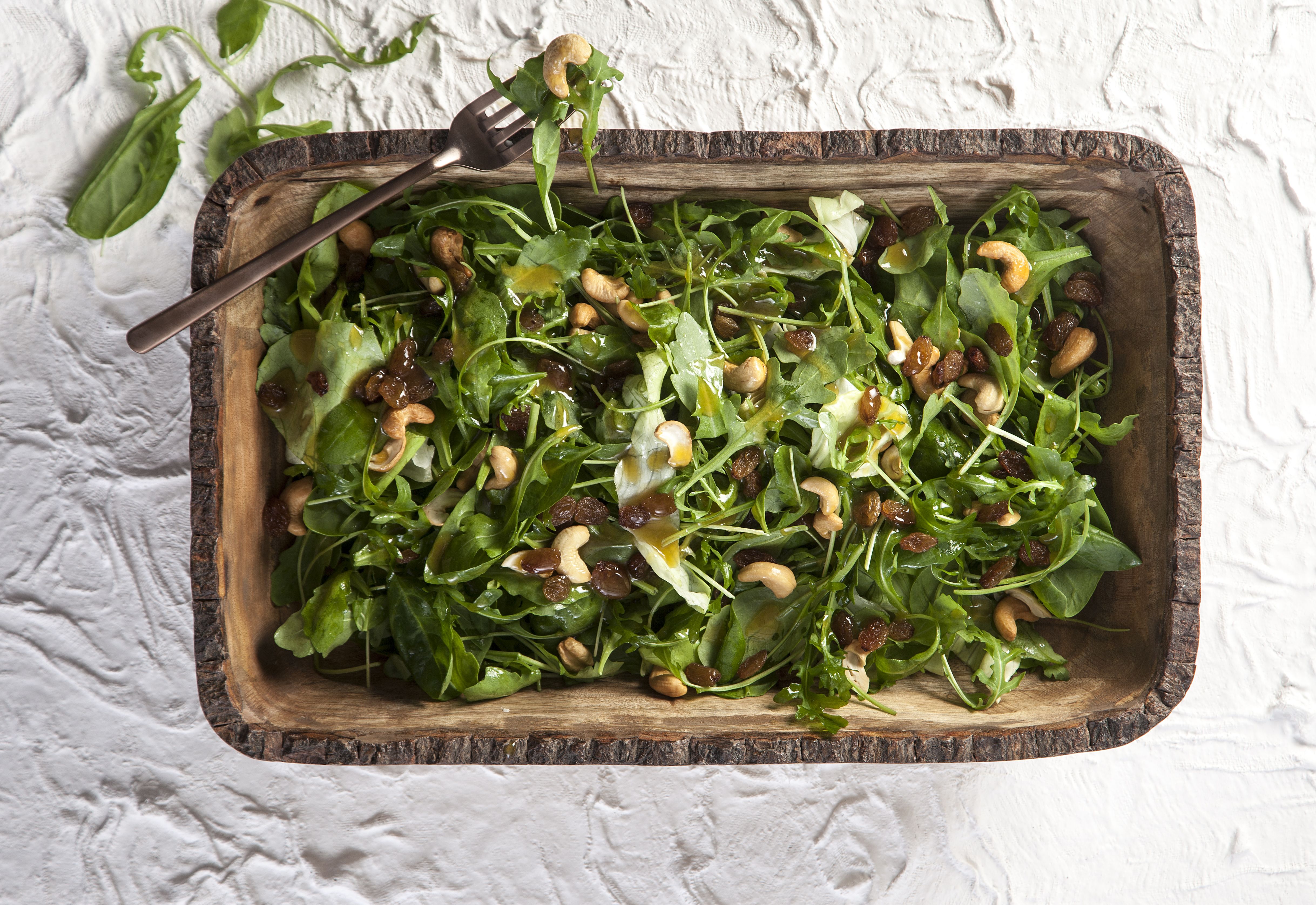 Προσθέτουμε στην πράσινη σαλάτα σταφίδες, κάσιους και μια πρωτότυπη βινεγκρέτ από ξίδι ροδιού.