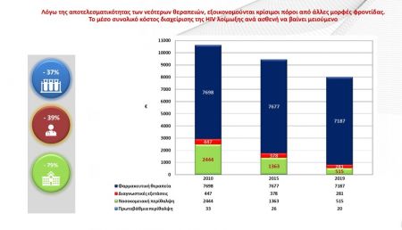 Μέσα, λοιπόν, από τη σημαντική μελέτη που εκπόνησε ο Ομότιμος Καθηγητής Εθνικής Σχολής Δημόσιας Υγείας, κ. Γιάννης Κυριόπουλος, αποτυπώνονται αναλυτικά και με σαφή στοιχεία οι συνολικές δαπάνες για τη θεραπευτική διαχείριση της HIV λοίμωξης στο διάστημα 2015-2019, αποδεικνύοντας ότι αυτή δεν είναι μόνο ευεργετική για τους ασθενείς –γεγονός ήδη εμφανές από την επέκταση του προσδόκιμου ζωής και τη μείωση της συννοσηρότητας- αλλά και οικονομικά αποδοτική για το σύστημα υγείας.