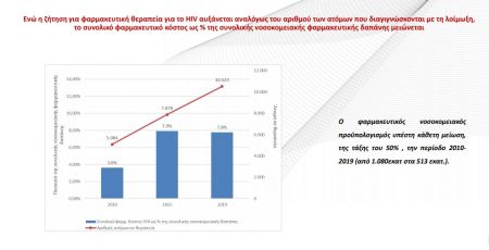 Η θετική οικονομική απόδοση της θεραπευτικής διαχείρισης του HIV καθίσταται ακόμη πιο σαφής όταν συγκρίνουμε τη ζήτηση για φαρμακευτική θεραπεία, η οποία αυξάνεται κατά ευθέως ανάλογο τρόπο με τις νέες διαγνώσεις, με το συνολικό φαρμακευτικό κόστος του HIV ως ποσοστό της συνολικής νοσοκομειακής φαρμακευτικής δαπάνης, το οποίο με την πάροδο του χρόνου… μειώνεται. Με άλλα λόγια, η δαπάνη για την φαρμακευτική διαχείριση της HIV λοίμωξης δεν συμβάλλει στην αύξηση της νοσοκομειακής δαπάνης, όπως αυτή καταγράφεται την τελευταία δεκαετία.