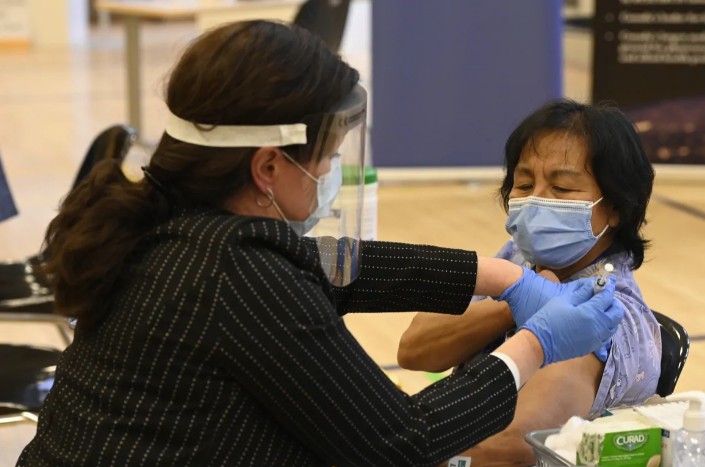 Μέλη του νοσηλευτικού και ιατρικού προσωπικού, φορώντας μάσκες, έσπευσαν να την χειροκροτήσουν, αμέσως μετά τον εμβολιασμό της.