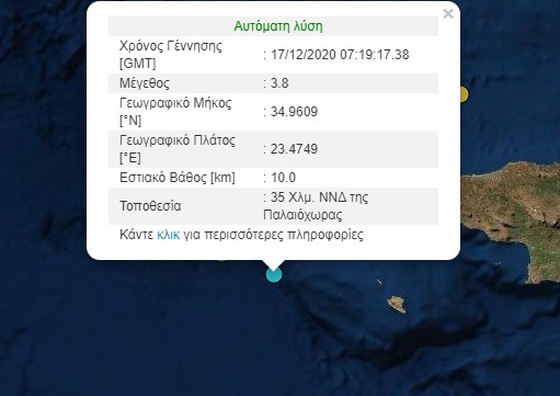 Σεισμός, 3,8 Ρίχτερ σημειώθηκε το πρωί της Πέμπτης στα ανοιχτά της Κρήτης,στην κωμόπολη Παλαιόχωρα, του νομού Χανίων.